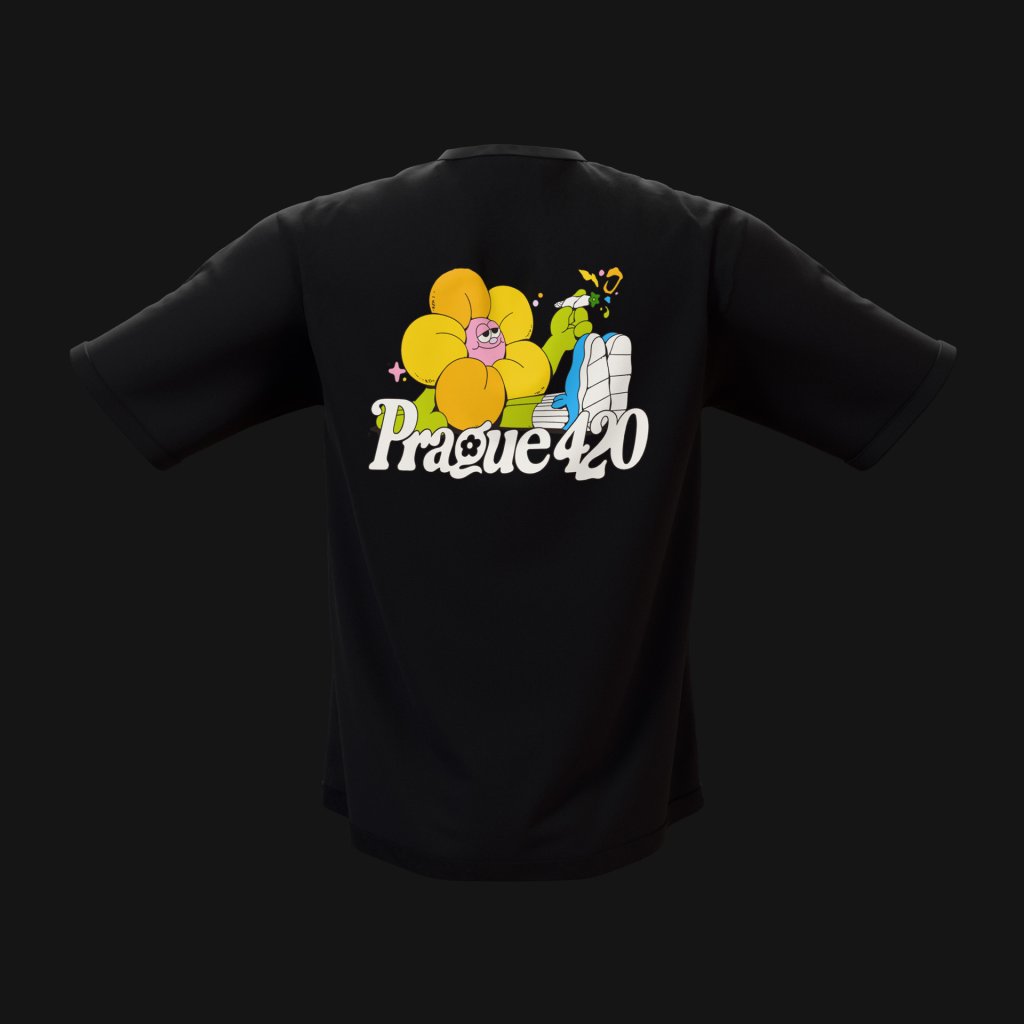 Černé tričko Prague420 s festivalovým maskotem na zádech a logem Prague420 na hrudi. Design inspirovaný 420 kulturou a atmosférou Prague420.
